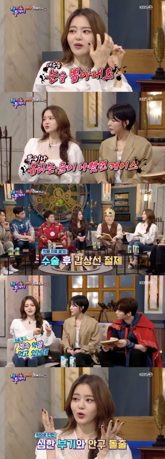 서유리는 “3년 전부터 병을 앓았다. 그레이브스병은 각종 합병증이 있는데 나는 최악의 케이스였다. 약으로 치료도 안 되고 수술을 해야 했다”라며, “갑상선을 제거했고 계속 약을 먹는데 이 약은 얼굴을 붓고 눈을 돌출되게 한다”라고 밝혔다.
