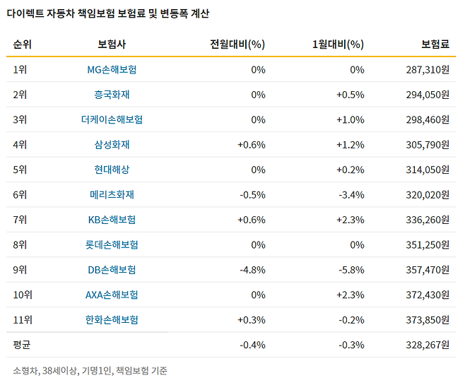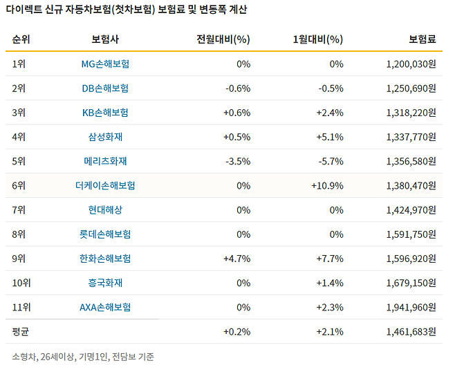 26세 남성(기명1인), 소형차를 기준으로 견적을 낸 신규 자동차 보험료는 평균 약 146만원이다. 가장 저렴한 보험사는 MG손해보험이며, DB손해보험 KB손해보험 삼성화재 메리츠화재 등이 뒤를 이었다. 신규 자동차 보험 가입자는 다른 운전자 그룹보다 보험료 인상률이 가파른 것으로 전해졌다. 11개 손해보험사 중 최근 4달 간 보험료를 인상한 곳은 6곳이며, 평균 인상률은 4.97%에 달했다.