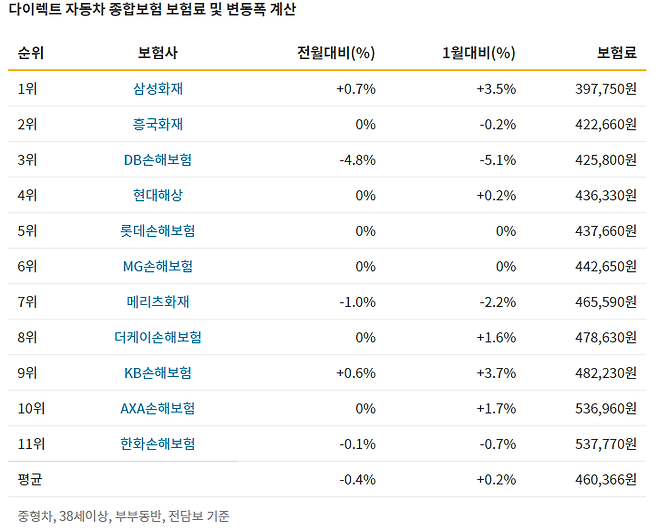 먼저, 중형차를 운행하는 38세 부부 운전자(모두 35세 이상)의 경우 11개 손해보험사의 평균 보험료는 약 46만원으로 나타났다(전담보 기준). 해당 조건에서 자동차 보험료는 삼성화재 흥국화재 DB손해보험 현대해상 롯데손해보험 순으로 저렴하게 책정됐다.