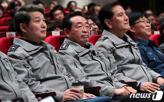 (서울=뉴스1) 이재명 기자 = 원경환 서울지방경찰청장이 28일 오후 서울 종로구 서울지방경찰청에서 열린 인권 대토론회에서 영화 '재심' 주인공 박준형 변호사의 강연을 듣고 있다. 2019.3.28/뉴스1