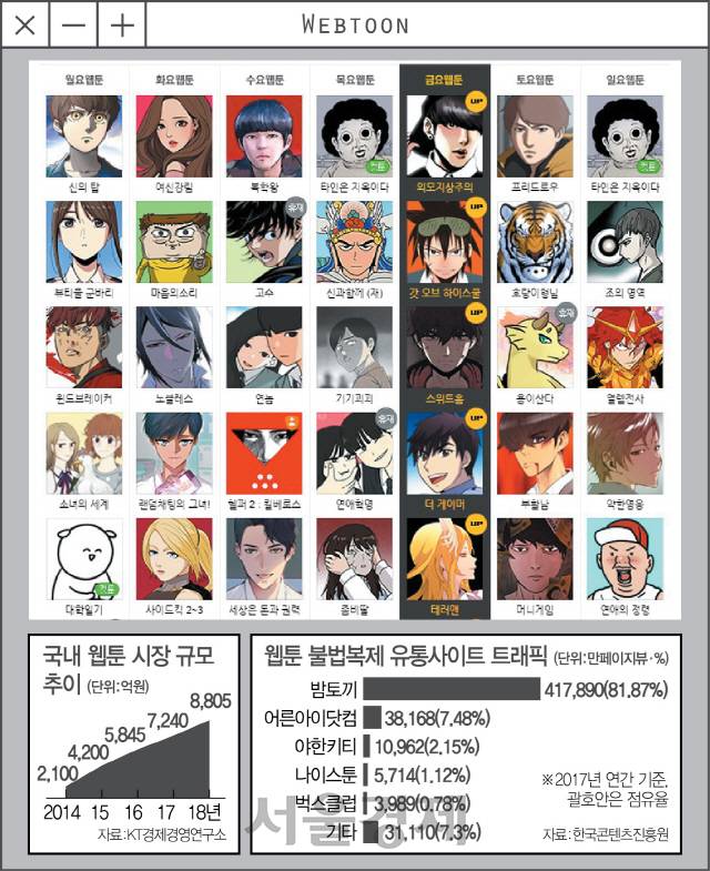 그러나 대형 불법공유 사이트가 폐쇄돼도 대체 사이트가 연이어 등장하는 현실에 업계는 속만 끓이고 있다. 2017년 한국콘텐츠진흥원이 진행한 만화·웹툰 불법유통 실태조사에 따르면 불법으로 인한 웹툰 시장의 피해 규모는 약 1조원에 이른다. 실제 최근 적발된 주요 사이트들의 연간 페이지뷰가 총 51억건에 달해 합법적인 업체들보다 오히려 높은 것으로 나타났다.