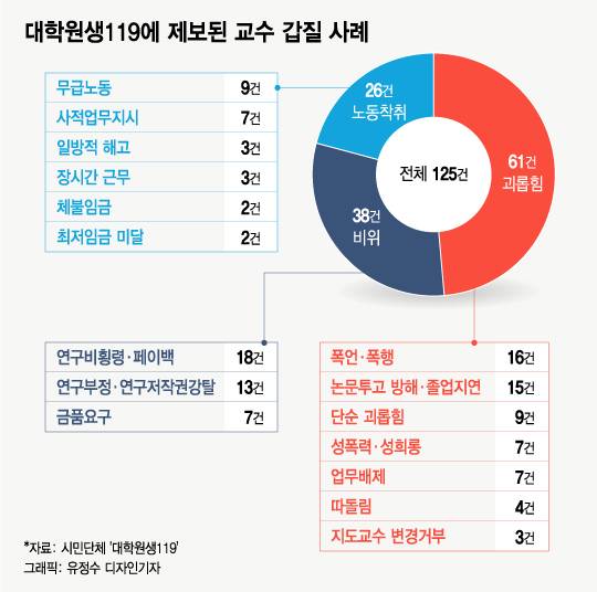 6일 교수 갑질 근절을 위한 시민단체 '대학원생119'에 따르면 올해 1월7일부터 지난 5일까지 최근 5개월 동안 접수받은 '교수 갑질' 제보는 61차례, 125건에 달한다.