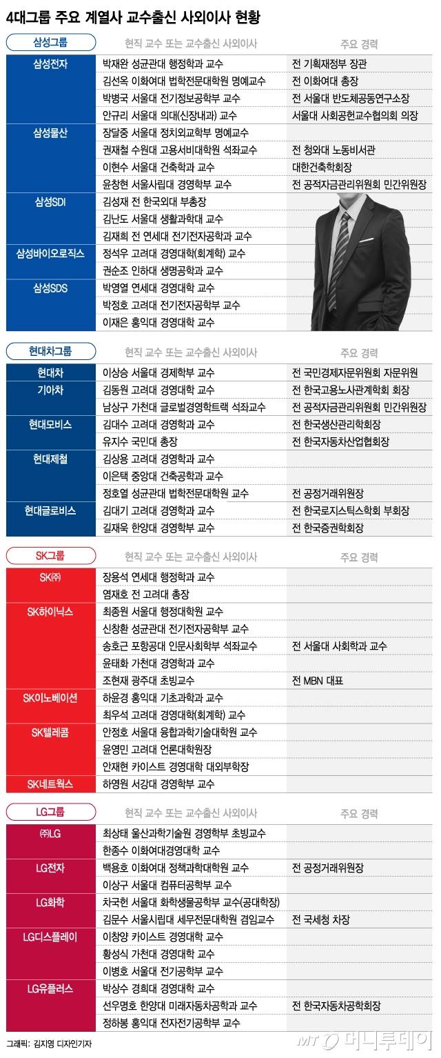 사외이사 비중이 가장 큰 그룹은 삼성이었다. 삼성전자·물산·SDI·SDS·바이오로직스 5개사의 사외이사 22명 중 무려 16명(72.7%)이 교수군으로 확인됐다. 대표적으로 삼성전자는 총 6명으로 구성된 사외이사진 중 4명을 박재완 성균관대 행정학과 교수와 김선옥 이화여대 법학전문대학원 명예교수, 박병국 서울대 전기정보공학부 교수, 안규리 서울대 의대(신장내과) 교수 등으로 채웠다. 삼성물산도 사외이사 5명 중 4명이 교수였다.
