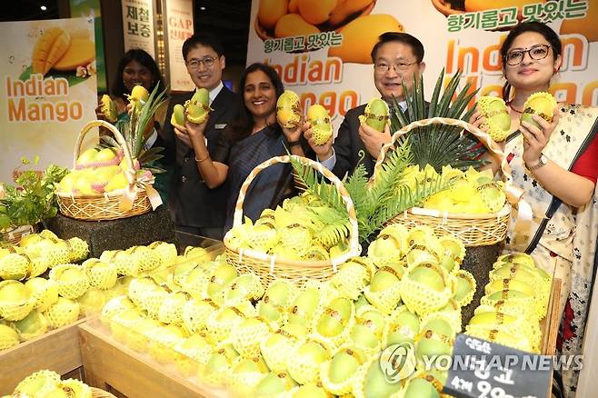 (대구=연합뉴스) 김현태 기자 = 7일 대구 신세계백화점 지하1층 식품관에서 열린 인도산 망고 출시 행사에서 스리프리야 랑가나탄 주한 인도대사(가운데)와 대구 신세계백화점 정건희 대표이사(왼쪽 두번째) 등 참석자들이 인도 망고를 선보이고 있다.