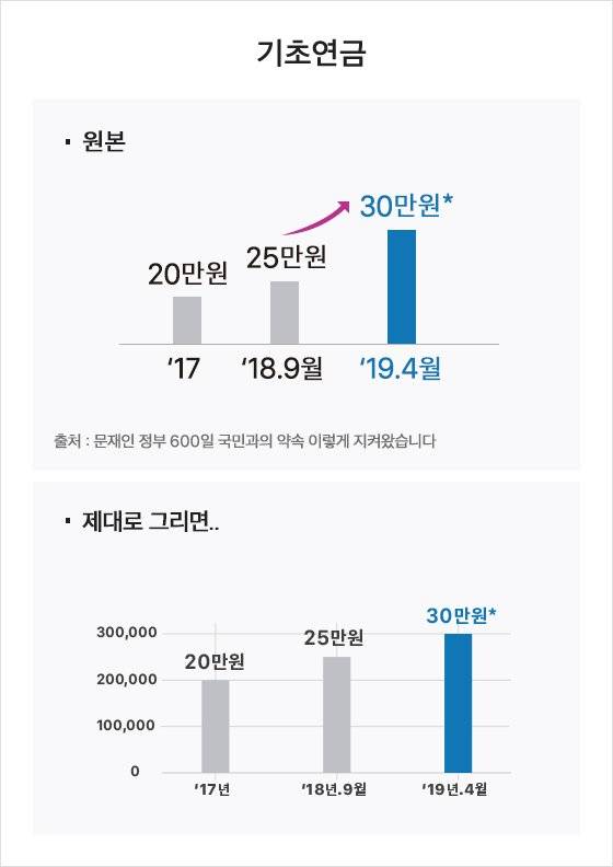기초연금은 2017~2018년, 2018~2019년 똑같이 5만원씩 올랐다. 기초연금이 2년 새 20만원에서 30만원으로 10만원 올랐지만, 그래프는 2배가량 오른 것처럼 그렸다.