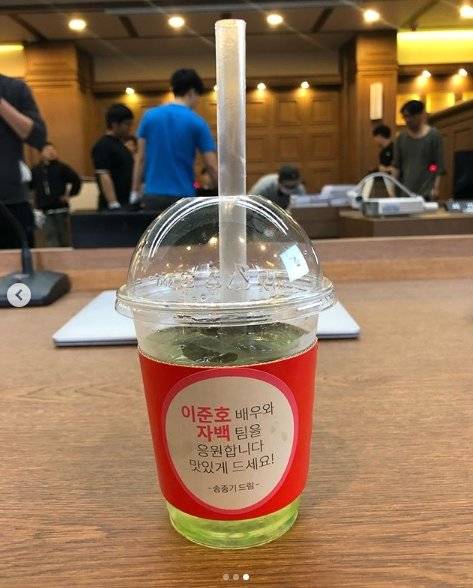 공개된 사진 속 이준호는 배우 송중기가 선물한 커피차의 음료를 손에 든 채 인증샷을 촬영하고 있다. 컵 홀더에는 '이준호 배우의 자백팀을 응원합니다. 맛있게 드세요! -송중기 드림'이라는 문구가 적혀 있다.