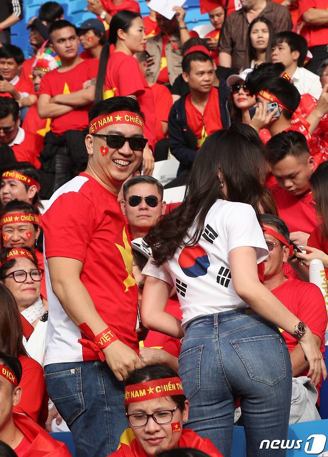 (두바이(UAE)=뉴스1) 신웅수 기자 = 24일 오후(현지시간) 아랍에미리트연합(UAE) 두바이 알막툼 스타디움에서 열린 2019 아시아축구연맹(AFC) 아시안컵 8강 베트남과 일본의 경기에서 앞은 금성홍기, 뒤는 태극기가 그려진 유니폼을 입은 베트남 응원단이 열띤 응원을 하고 있다. 2019.1.24/뉴스1