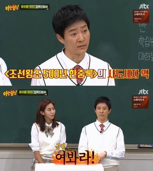 13일 오후 방송된 JTBC '아는형님'에서는 KBS2 드라마 '하나뿐인 내편'으로 호흡을 맞춘 배우 최수종, 유이가 전학생으로 출연했다.