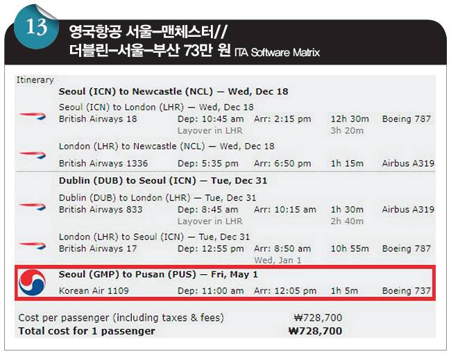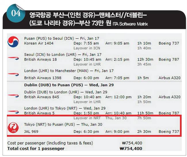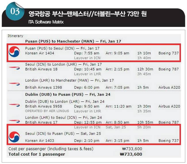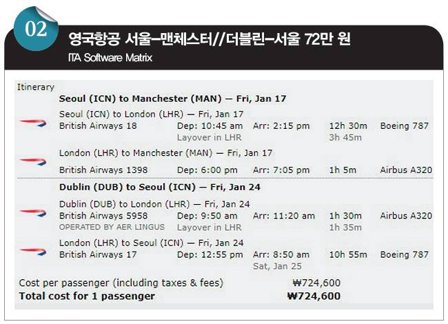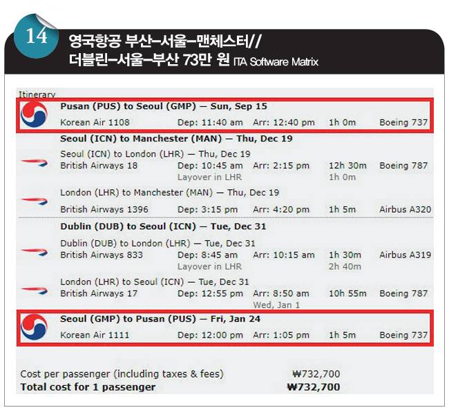 설 연휴를 앞두고 영국 맨체스터로 '인'하고 아일랜드 더블린에서 '아웃'하는 영국항공의 항공권입니다. 출발일과 귀국일에 김해국제공항~인천국제공항을 왕복하는 대한항공(KE) 항공편을 제외하면 서울 출발과 부산 출발의 차이는 없습니다. 가격은 서울 출발은 72만 원, 부산 출발은 73만 원입니다. 즉 부산-인천 구간 탑승 시 부과되는 국내선 공항세만 내면 되는 겁니다.