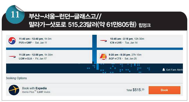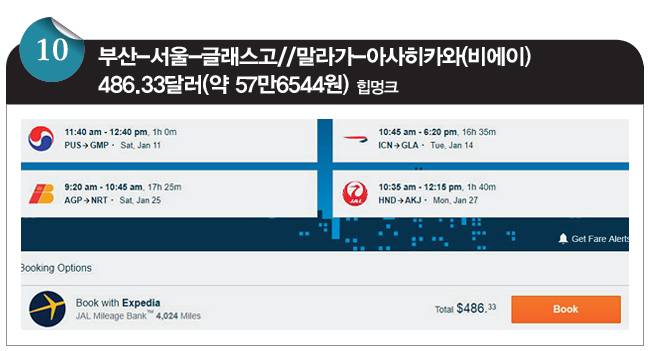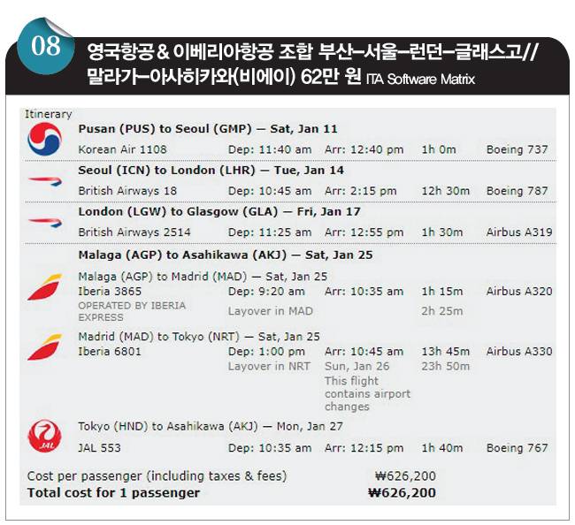 이 항공권은 부산 출발로 서울과 런던을 스톱오버하고(방향당 두 번의 무료 스톱오버를 최대한 활용하고) 스코틀랜드 글래스고로 들어갔다, 스페인 안달루시아 지방의 중심 도시 말라가에서 아웃해 이베리아항공을 타고 비에이(아사히카와)로 돌아오는 코스입니다. 영국항공의 한국 출발 유럽행 운임과 이베리아항공의 유럽 출발 일본행 운임을 결합해 사용하는데, 심상치 않게 저렴합니다. 출발지 국가가 아닌 다른 국가로 돌아오는 항공권은 항공권 가격 계산이 예상치 못하게 꼬여 마법처럼 싼 경우가 종종 있는데, 영국항공-이베리아항공 조합이 그런 사례입니다.