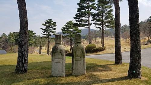 이 골프장 곳곳에는 오래된 유물 같은 느낌의 석물 장식들이 자리잡고 있습니다. 아무데나 있는 것이 아니고 꼭 있어야 할 자리에 마치 오래 전부터 원래 있었던 것처럼 잘 어울리며 서 있습니다. 이런 석물들은 대개 남의 무덤에 놓였던 것으로 보일 수 있는데, 눈 여겨 보면 남의 무덤에서 캐온 것이 아니라 새로 만든 작품임을 알 수 있습니다. 서구적인 느낌의 코스에 한국의 전통미가 느껴지는 석물 조형작품들이 은근히 잘 어울립니다. 예술작품들을 골프코스에 장식으로 놓는 행위들을 좋게만 보지 않는 분들도 많은데, 이것들은 한옥 <파지오하우스>와 어울려 이 골프장을 기억하게 하는 '아이덴티티 요소'로 기억되기도 합니다.