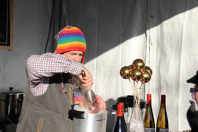 행사장에 우뚝 선 이정표를 보며 어디로 갈까 생각하다 줄이 긴 부스 쪽으로 걸음을 옮겼다. 항상 손님이 많은 곳의 와인은 손해 볼 확률이 현저히 낮은 법이니까. 그곳에서는 몹시 추운 독일의 겨울에 원기 회복이나 감기 예방을 위해 마신다는 글루바인(Gluhwein)을 판매하고 있었다. 북미에서는 뮬드 와인(Mulled wine)으로도 통한다.