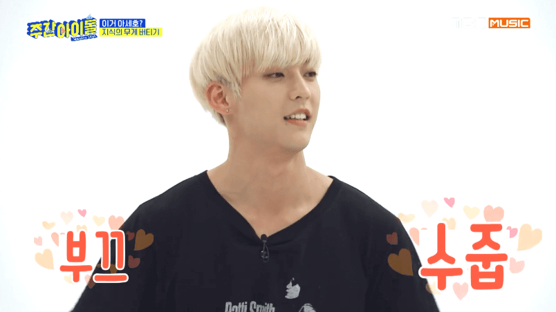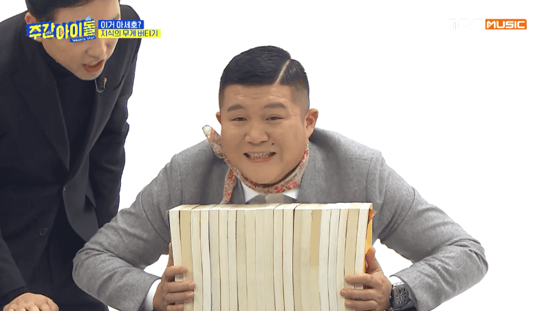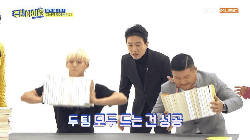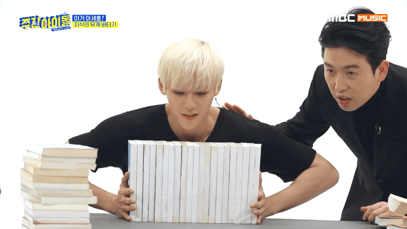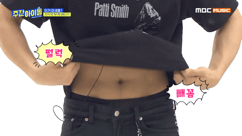 [움짤] '주간아이돌' 이민혁, '지식의 무게 버티기'서 조세호에 패.. 복근 공개