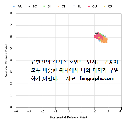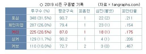 반면 약점은 (우타자) 몸쪽이었다. 그런데 커터로 인해 보완책이 생겼다. 파울이나 땅볼을 유도할 수 있게 되면서다. 게다가 좌타자에게는 먼쪽으로 빠져나가는 성질이다. 슬라이더와 비슷한 효과를 발휘한다. 투구판의 1루쪽 끝을 활용한다는 점도 휘어짐 효과를 극대화시키는 요인이 됐다.