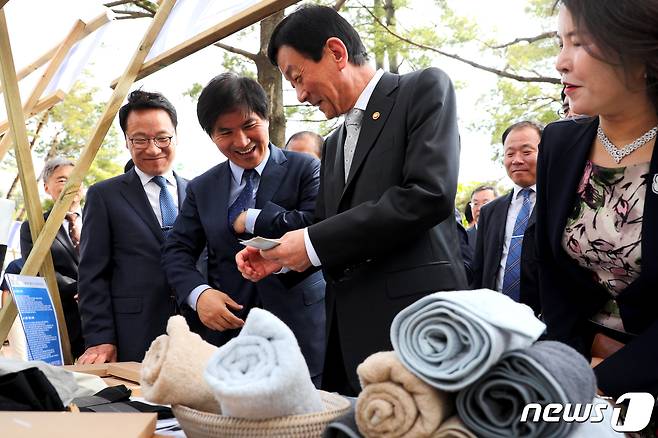 (춘천=뉴스1) 김경석 기자 = 진영 행정안전부 장관이 15일 오후 강원대학교 춘천캠퍼스에서 열린 실패박람회에서 한 청년상인 제품을 구입하기 위해 강원상품권을 꺼내고 있다. 2019.5.15/뉴스1