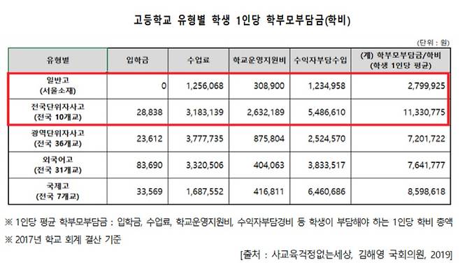 전국단위 자사고 학비 연간 1100만원, 일반고의 4배