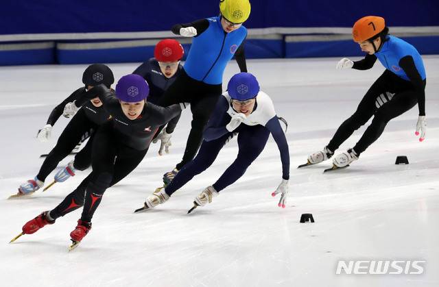 【서울=뉴시스】홍효식 기자 = 3일 오전 서울 양천구 목동실내빙상장에서 열린 '2019/2020시즌 쇼트트랙 국가대표 1차 선발대회' 여자부 1500M 결승에서 노도희(보라헬멧)가 역주하고 있다. 2019.04.03.