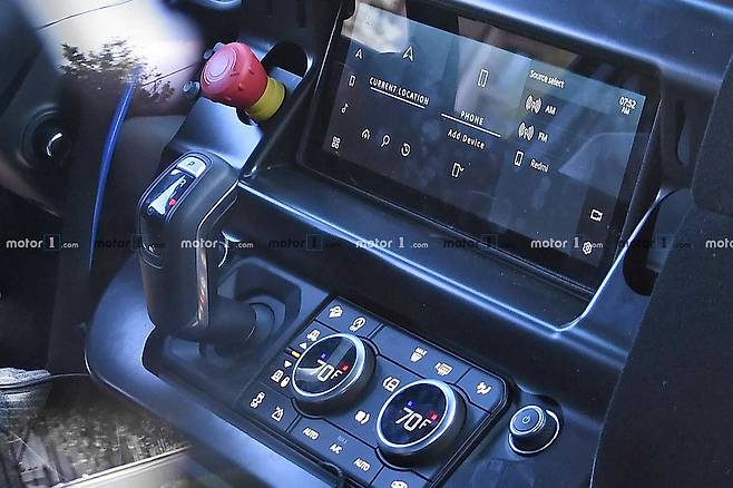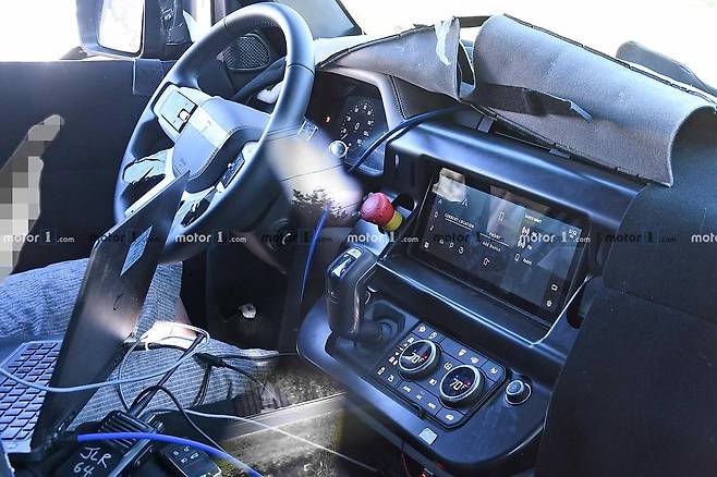 이번에 처음 공개된 신형 디펜더 양산차의 실내는 독특한 대시보드 구성이 특징이다. 와이드형 인포테인먼트 모니터와 전자식 기어레버, 공조장치 컨트롤러가 통합된 형태다. 국내 모델 기아차 레이와 유사하다. 전자식 클러스터와 4-스포크 스티어링 휠이 확인된다.