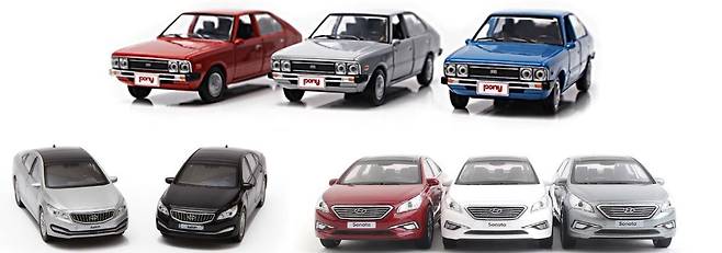 이미 대형 마트에서 많이 봤을 현대자동차 1:38 크기 모형이다. 작은 크기를 고려하면 제법 섬세하게 만들어 장식용으로 좋다. 그러나 뒤로 당기면 앞으로 나아가는 영락없는 장난감이기도 하다. 모델은 쏘나타(LF 부분변경 전), 아반떼(AD, 부분변경 전), 아이오닉(부분변경 전), 아슬란, 투싼(TL, 부분변경 전), 현대 포니, 싼타페(DM) 등 모두 구형 뿐이다. 값은 1만2,000원. 기아자동차와 제네시스도 비슷한 크기의 여러 모델을 판매 중이다.