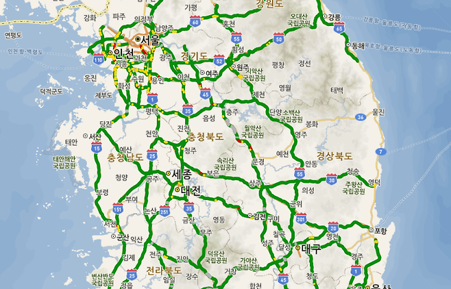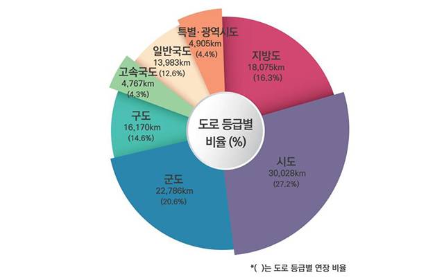 도로 등급별 길이는 살펴보면 고속국도 4,767km, 일반국도 1만3,983km, 특별·광역시도 4,905km, 지방도 1만8,075km, 시도 3만28km, 군도 2만2,786km, 구도 1만6,170km로 파악됐습니다.