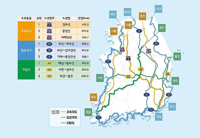 도로 등급별로 나눠서 살펴보면 고속국도는 경부선(1호선, 415.3km), 일반국도는 부산~파주선(77호선, 695.3km), 지방도는 해남~원주선(49호선, 383.9km)이 가장 긴 도로로 확인됐습니다. 좀 더 자세히 살펴보겠습니다.