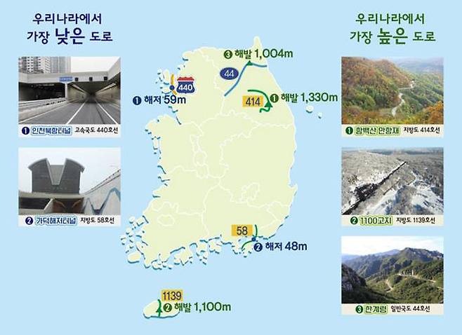 우리나라에서 가장 높은 도로는 지방도 414호선의 함백산 ’만항재‘ 구간으로 해발 1,330m이며, 가장 낮은 도로는 바다 아래 59m에 설치된 도로인 고속국도 440호(인천~김포간)의 ’인천북항터널‘입니다.