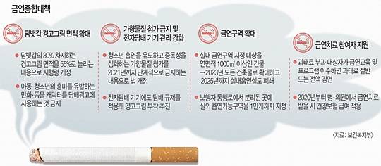 정부는 우선 실내 금연구역 규정을 강화한다. 현재 연면적 1000㎡ 이상 건축물 및 일부 공중이용시설을 실내 금연구역으로 지정하고 있는데 이를 2021년 연면적 500㎡ 이상 건축물로 확대한다. 2023년에는 모든 건축물을 금연구역에 포함시키고 2025년까지 실내흡연실을 모두 폐쇄한다.