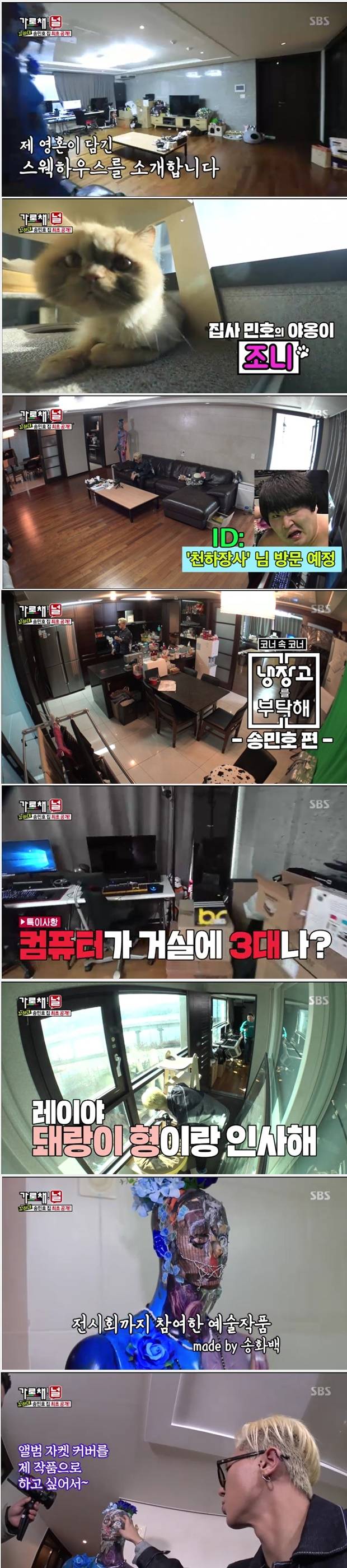 이날 송민호는 위너의 멤버 김진우와 함께 거주하는 숙소에서 강호동과 대결을 펼쳤다. 숙소를 방문한 강호동은 민호의 집 이곳저곳을 둘러봤다. 가장 먼저 눈에 띄는 것은 최신식 컴퓨터. 민호는 “저랑 진우형, 매니저까지 게임을 좋아해 진짜 PC방에서 쓰는 최고 사양의 컴퓨터를 설치했다”고 자랑했다. 이어 베란다에서 사는 반려묘인 레이, 조니, 베이도 소개했다.