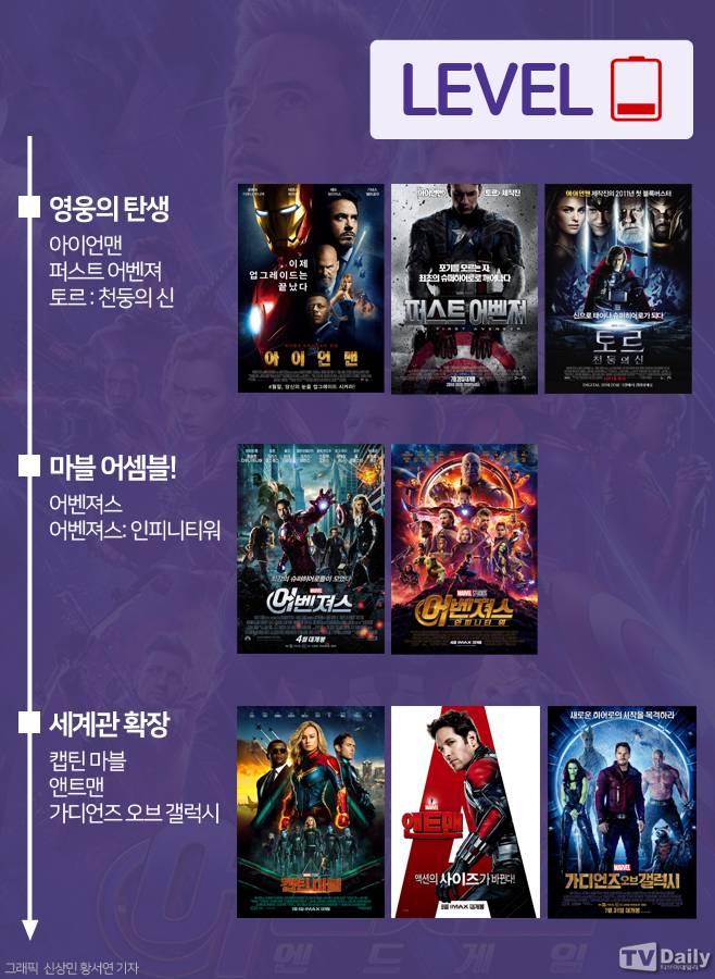 [티브이데일리 신상민 기자] 마블 시네마틱 유니버스(MCU)는 11년의 역사를 자랑한다. 2008년 ‘아이언맨’의 등장을 시작된 MCU는 총 21개의 작품을 내놓았다. 특히 페이즈3의 대미를 장식할 ‘어벤져스:엔드게임’의 경우 11년의 MCU를 집대성한 작품이라는 점에서 전세계 팬들의 관심을 한 몸에 받고 있다. 이에 ‘어벤져스:엔드게임’ 영접 전 수준별 MCU 다시 보기 방법을 공개한다.