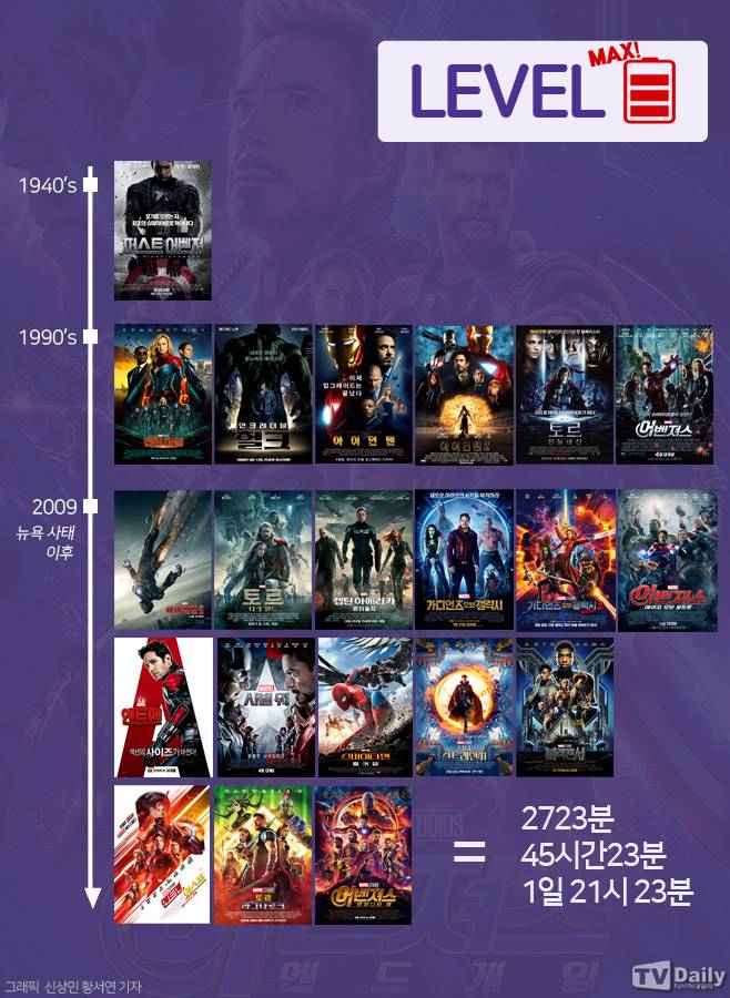 끝으로 ‘앤드맨과 와스프’를 보고 ‘토르: 라그나르크’, ‘어벤져스:인피니티 워’를 본다면 대망의 21편을 모두 정주행 하게 된다. 다만, 모든 영화를 정주행 하기 위해서는 러닝타임 기준 2723분이 걸린다. 쉽게 말해서 하루 하고도 22시간을 마블 영화만 봐야만 정주행이 가능하다는 사실.