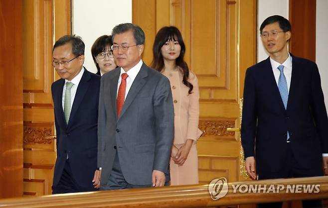 (서울=연합뉴스) 배재만 기자 = 문재인 대통령이 25일 오후 청와대에서 문형배-이미선 신임 헌법재판소 재판관에게 임명장을 수여한 뒤 환담장으로 향하고 있다. 왼쪽부터 유남석 헌법재판소장, 이미선 재판관, 문 대통령, 문형배 재판관 부인 이경아 씨, 문형배 재판관. 2019.4.25