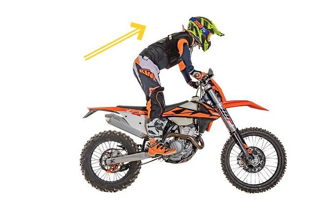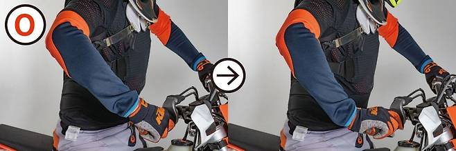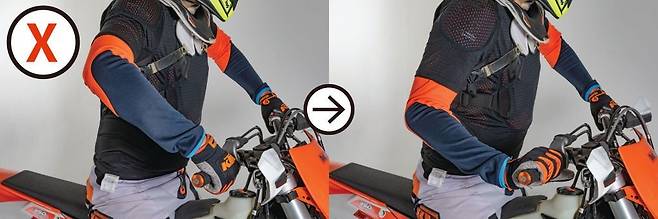 다음은 팔꿈치입니다. 오프로드 바이크는 흙과 돌로 이루어진 노면에서 주행하기 때문에 계속되는 충격을 견뎌야 합니다. 동시에 조향도 가능해야 합니다. 팔꿈치를 세워 노면에서 오는 충격을 받아줍니다. 조향을 할 때도 팔꿈치가 내려가면 핸들을 돌릴 때 몸에 걸려 자유로운 조작이 불가능해지고 전도로 이어질 수 있습니다. 팔꿈치를 세우는 노력을 해야 더욱 빠른 속도에서 조작하거나 다른 기술을 구사할 수 있습니다. 자연스럽게 뒤에 앉게 되는 것도 예방할 수 있습니다.