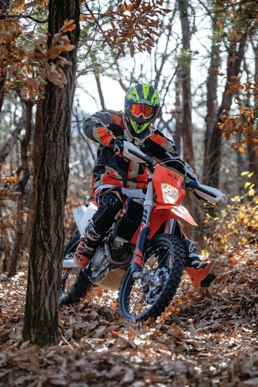 선회 자세에서 온로드와 가장 다른 점은 린 아웃입니다. 노면의 그립이 아스팔트처럼 고르지 않기 때문에 타이어의 미끄러짐에 대비해야 합니다. 바이크가 기우는 것에 반대로 상체를 세우는 것을 린 아웃이라고 합니다. 선회가 시작되면 시트의 앞쪽, 그리고 기우는 반대쪽의 라인으로 옮겨 앉으면서 앞바퀴에 하중을 실어줍니다. 동시에 안쪽 다리를 앞으로 뻗어줍니다. 리어 타이어가 미끄러지더라도 무게 중심이 앞에 있기 때문에 핸들 조작과 발을 디디는 동작만으로 대처할 수 있습니다. 여전히 팔꿈치는 세워져 있어야 조향하기에 유리합니다.