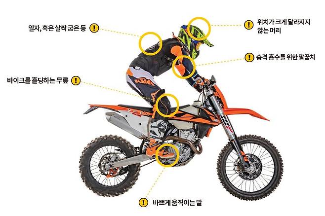바이크와 안전장비가 준비됐다면 이제 바이크에 올라볼 차례입니다. 무엇이든 시작이 가장 중요하다는 말이 있습니다. 기초 공사를 잘해야 건물을 높게 올려도 무너지지 않습니다. 기본적인 엔듀로 주행 자세에 대해서 소개합니다.