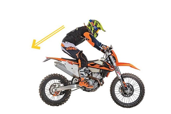 동일하게 린 아웃으로 코너를 돌아나가기 때문에 기본 스탠딩 자세에서 무릎과 팔로 바이크를 기울이고 엉덩이를 바깥쪽으로 빼면서 중심을 맞춥니다. 여기서 주의할 점은 엉덩이만 옆으로 뺀다는 생각보다 가슴 전체를 선회하는 방향으로 틀어주는 것입니다. 또한 온로드에서 선회하듯 몸을 뒤로 뺀 채 선회하면 위험합니다. 라이더의 무게중심이 바이크 가운데 있거나 앞쪽에 위치하는 것이 좋습니다. 속도에 따라 체중을 앞으로 옮겨서 가속으로 생기는 저항과 무게중심이 알맞게 작용하도록 해야 합니다. 고속주행일수록 라이더의 중심이 높아지지 않도록 주의해야 합니다.
