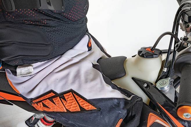 기본자세에서 가장 포인트가 되는 부분은 시트 포지션, 팔꿈치, 그립법, 스텝을 지지하는 위치입니다. 시트 포지션은 온로드 바이크에 오르듯 편하게 앉은 위치에서 앞으로 30cm 정도 옮겨 앉는 느낌입니다. 높은 출력과 가벼운 무게로 프런트가 떠오르는 것을 예방하고 무게 중심이 앞과 뒤로 쏠리지 않게 하기 위함입니다. 시트의 형상을 자세히 보면 기본적으로 앉아야 하는 위치의 두께가 가장 두껍습니다. 올바르게 위치한 것을 확인할 때는 스텝의 위치와 엉덩이의 위치가 지면과 수직으로 만나게 하고 프런트 서스펜션이 올라오는 방향에 맞게 머리가 위치하면 됩니다.