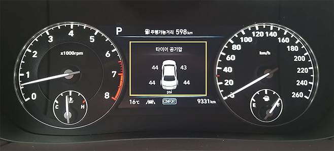 우리 팀에게 전달된 제네시스 G90의 권장 공기압은 35psi. 하지만 테스트카에는 44psi 수준의 공기압이 유지되고 있었다. 무려 9psi 가량 공기압이 높았던 것. 주행을 시작하면 내부 압력이 상승하는데, 우리 팀이 테스트한 G90은 주행 중 48psi 수준의 공기압을 보여주고 있었다.