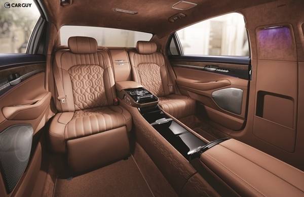 실내도 호화롭다. 우선 최고급 가죽으로 불리는 세미 애닐린 가죽으로 시트를 감쌌다. 색상 역시 고급스러운 분위기를 내는 브라운 톤으로 한껏 멋을 냈다. 퍼스트 클래스 VIP 시트는 자랑거리 중 하나다. 항공기 1등석 시트처럼 버튼 하나만 누르면 독서, 영상 시청, 휴식 등 다양한 착좌 모드로 바뀐다( 퍼스트 클래스 VIP 시트 선택 시에만 사용 가능). 다리까지 쭉 뻗을 수 있는 전동식 서포트를 포함하여 총 18개 방향으로 머리부터 발끝까지 시트를 조절할 수 있다. 장시간 앉아 있어도 피로함을 느끼기 어려울 정도의 편안함을 제공한다.