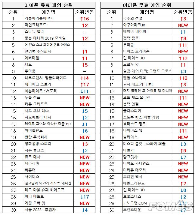 유료 게임 순위에서는 '리틀베리숲이야기'가 16계단 상승하며 1위를 차지했으며 지난주 중위권에 머물렀던 게임들 대부분 순위 상승이 이어졌다.