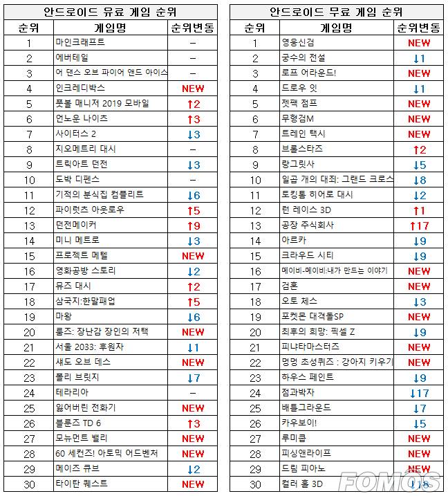 한편, 유료 게임 순위에서는 지난주 1위에서 3위까지 순위 변동이 없었으며 비트박스를 만드는 게임 '인크레디박스'가 새롭게 차트에 올라 4위를 기록했다.