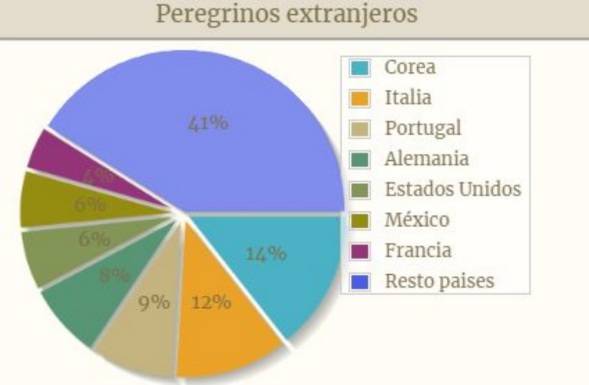 순례자의 길을 걷는 외국인들의 나라를 분석해 보았을 때 한국이 가장 큰 41%를 차지한다. 다른 나라와 비교가 안 될 정도로 큰 비중을 차지하고 있다. '윤식당', '꽃보다 할배', '같이 걸을까' 등 다양한 프로그램의 영향이 큰 몫을 차지한 것으로 보인다.