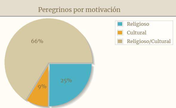 스페인 정부 기관 Oficina de Acogida al Peregrino 통계에 의하면 외국인들 중 문화 & 종교적 이유로 순례자의 길을 걷는 사람이 66%, 종교적 신앙심으로만 걷는 사람들이 25%, 문화 체험적 이유로 걷는 사람들이 9%다.