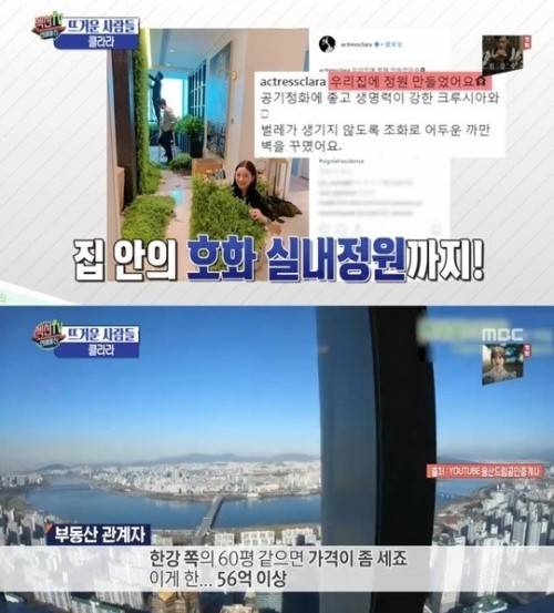 방송에서 부동산 관계자는 클라라의 신호집에 대해 "한강쪽 60평 같은데 가격이 세다"며 "56억원 이상"이라고 밝혔다.