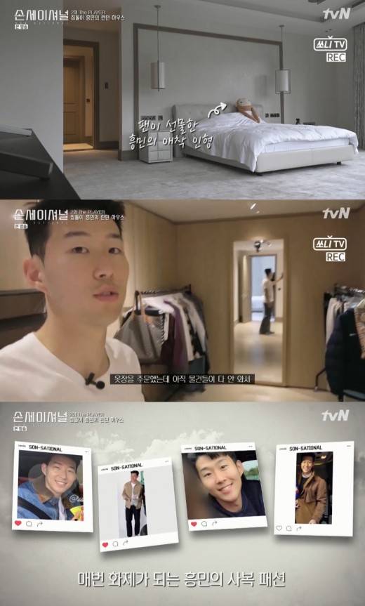 드레스룸도 공개했다. 손흥민은 “사람들이 제일 기대하는 게 나의 옷 방인데 아직 옷장이 안 와서 임시로 대충 해 놨다”라고 설명했다. 그 말대로 손흥민의 드레스룸엔 행거만이 드문드문 놓여 있었다.