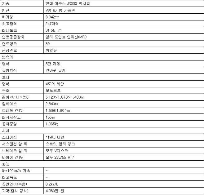 등급은 3.3L 가솔린 엔진에 5단 자동변속기를 맞물린 JS330 럭셔리. 사실 소장용으로는 V8 엔진 얹은 VS450이 제격이지만 동호회를 통해 들은 여러 골치 아픈 고질병이 맘에 걸렸다. 또 VS450과 JS380 모두 변속기에 수동 변속 기능이 없어 JS330으로 마음이 기울었다. 사실 최고출력 247마력이면 이미 충분한 출력이다. 실제로도 그렇고.