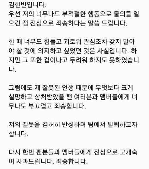 그러면서도 “부적절한 행동으로 물의를 일으켜 죄송하다”며 “저의 잘못을 겸허히 반성하며 팀에서 탈퇴하겠다”고 사과했다.