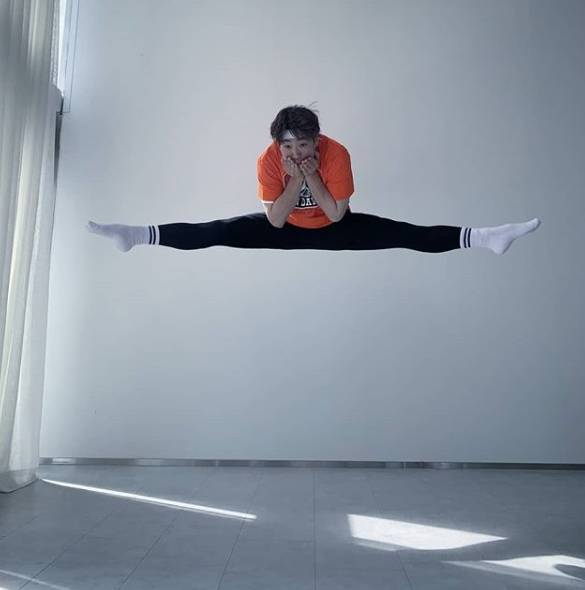 사진 속 안재홍은 티셔츠에 레깅스를 입고 1자 다리 찢기를 한 채 점프하고 있다.