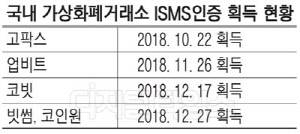국내 주요 가상화폐거래소가 모두 ISMS(정보보호관리체계) 획득을 완료했다.