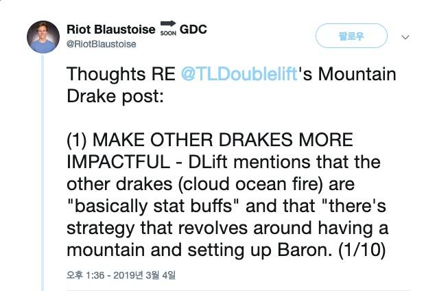 결국 라이엇 게임즈의 ‘블라우스터스’ 네이선 블라우는 5일 트위터에 드래곤 변화 방향에 대한 답변을 남겼다. 블라우가 제시한 방법은 총 3가지. 먼저 다른 용들의 영향력 확대를 고려하겠다고 밝혔다. 블라우는 “대지 드래곤은 상대하는 팀이 모든 신경을 내셔 남작에 곤두서게 만든다”며 현 상황을 부정적으로 보았다.