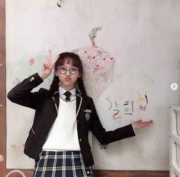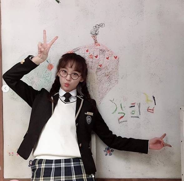 사진 속 진기주는 교복을 입고 양갈래 머리를 한 채 동그란 안경을 쓰고 있다.